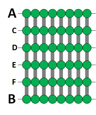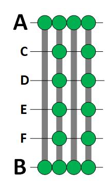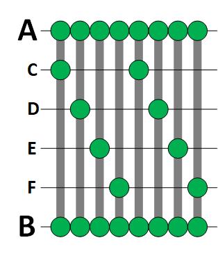 As all of the previously introduced stopping patterns have at least one significant drawback, sometimes a complex mixture of all of these is used to achieve a balance of benefits. In the pattern shown, there are two fast trains to achieve headline journey times between A and B, one slow train to facilitate local journeys, and four semi-fast trains which ensure each intermediate station gains a second train per hour but a competitive journey time from A to B is still achieved. Stopping patterns like this are often used on the busiest main lines. The complex nature of the resulting timetable means that any small change, even just adding one more station stop, can mean the whole timetable has to be rewritten.