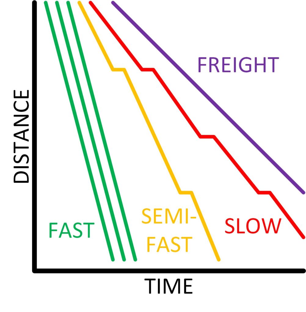 When a mixed stopping pattern is employed on a busy main line, train planners will often use a technique known as ‘flighting’ to try and accommodate as many trains as possible. This involves trains that have a similar speed or stopping pattern being grouped together, with the fastest trains running first, followed by semi-fast, then slow trains and freight. There then follows a gap before the next ‘flight’ begins. This pattern makes best use of available track capacity but prevents a regular service interval. For example, it may mean that all of the fast trains between two stations leave close together followed by a large gap. Evening these out through the hour would improve passenger experience but would allow fewer trains to be accommodated.