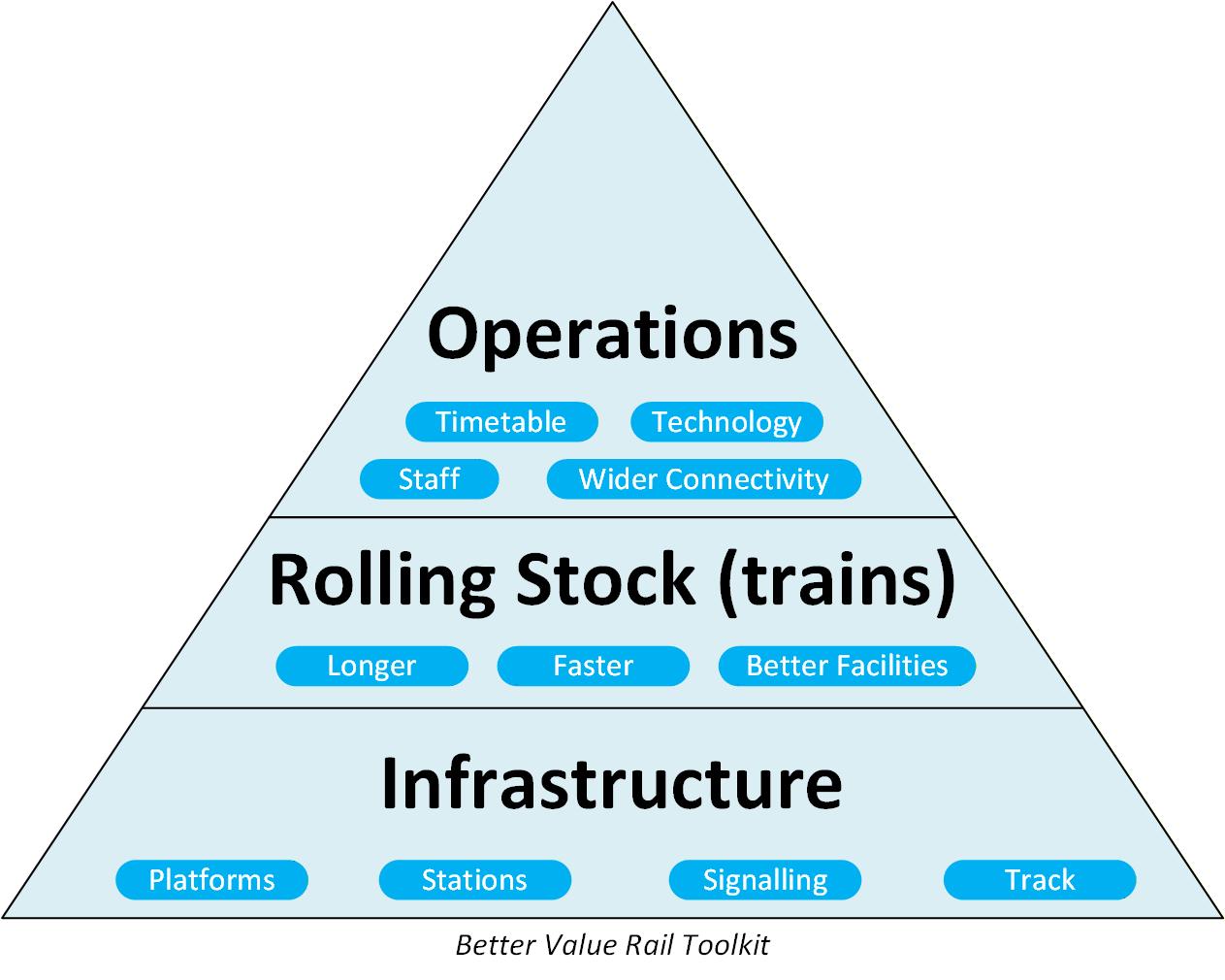 The diagram below shows the ‘Hierarchy of Rail Enhancements’, the preferred order that rail enhancements should be considered in. The triangle shape represents the increasing cost, complexity and delivery timescale that will be encountered the further down the hierarchy the option is.
